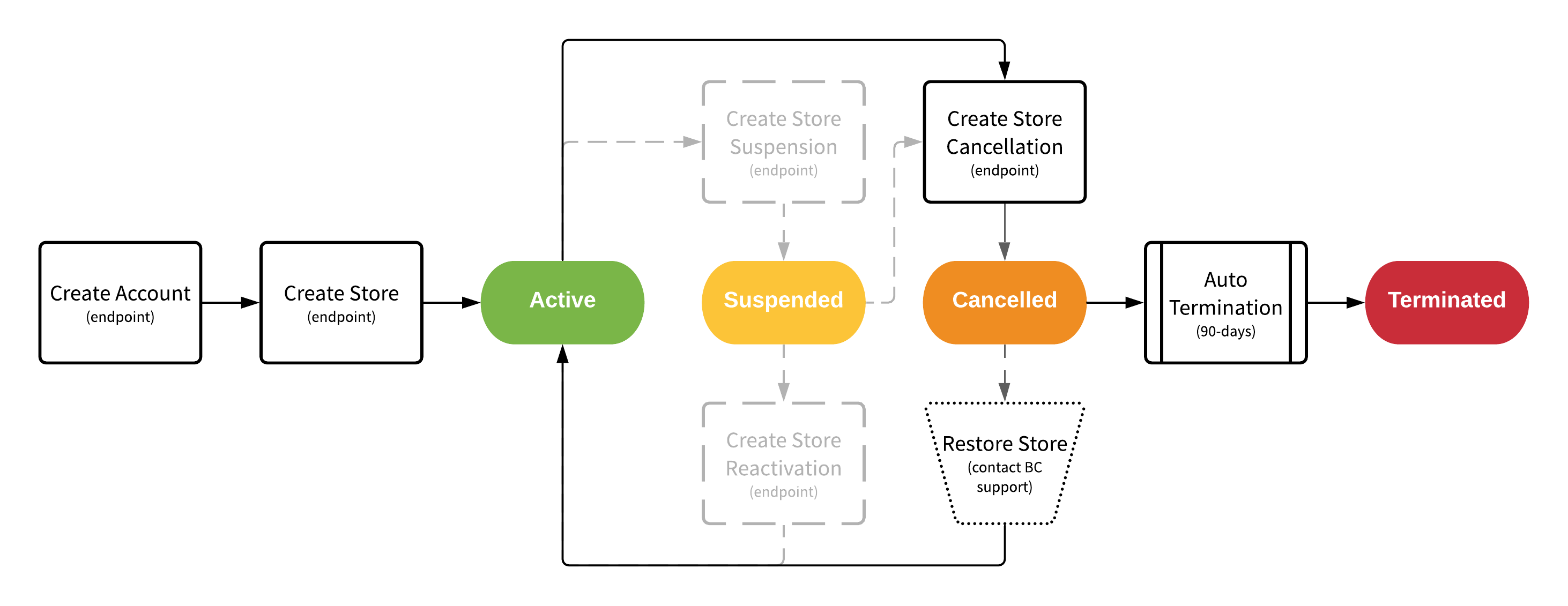 The diagram below depicts the standard workflow states and lifecycle of a BigCommerce store.