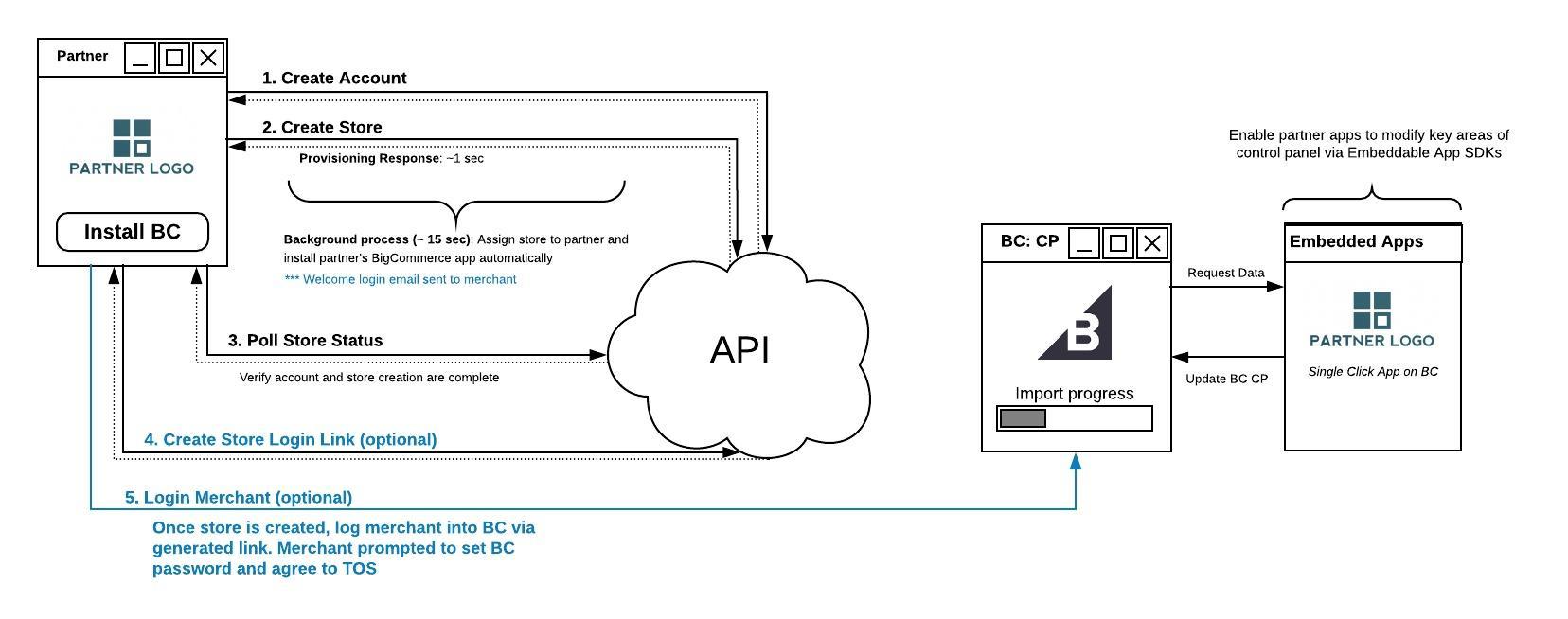 The steps below outline the recommended merchant onboarding flow to the BigCommerce platform: