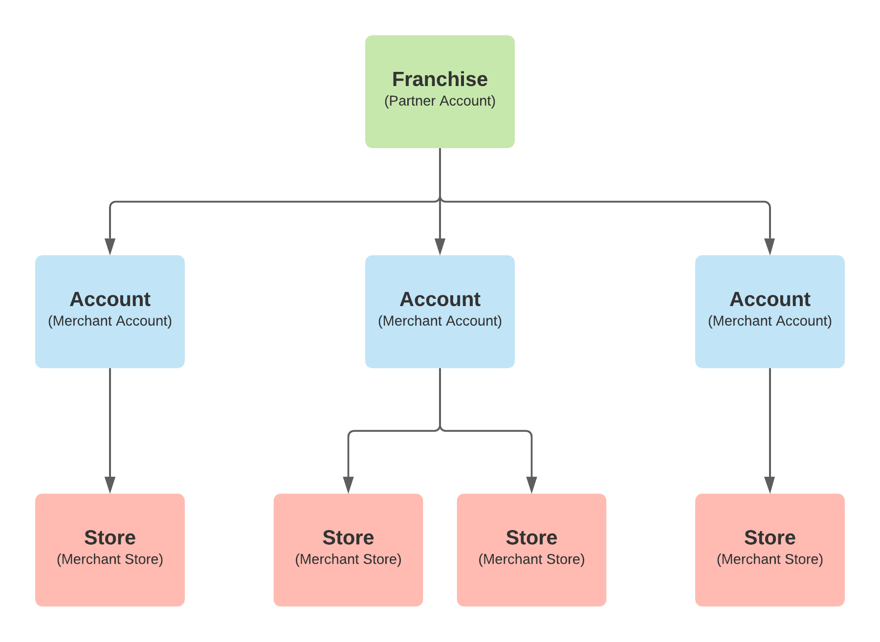 The Powered by solution consists of 3 primary data objects: a franchise, account, and store.